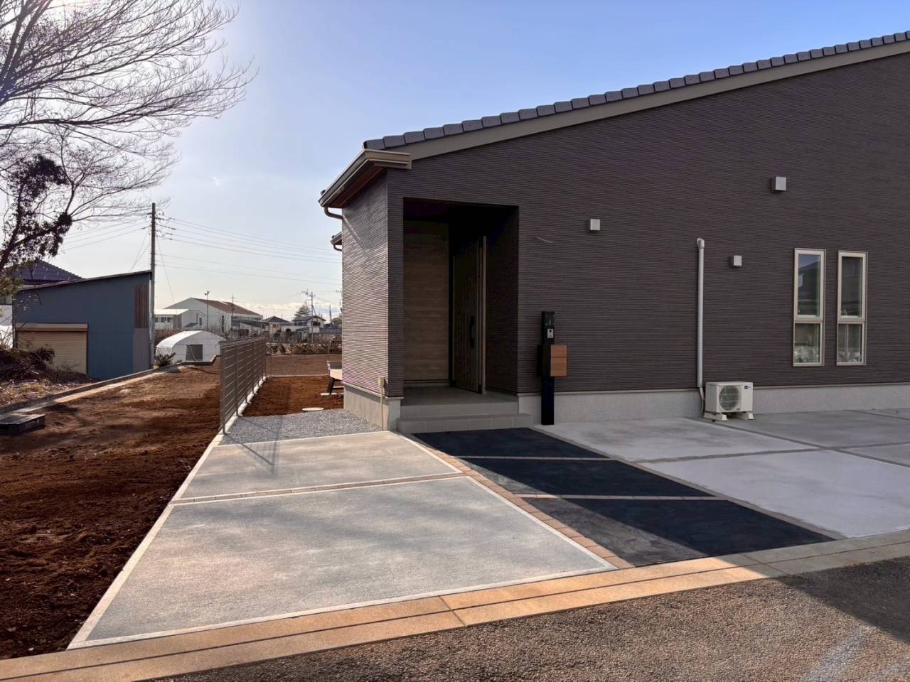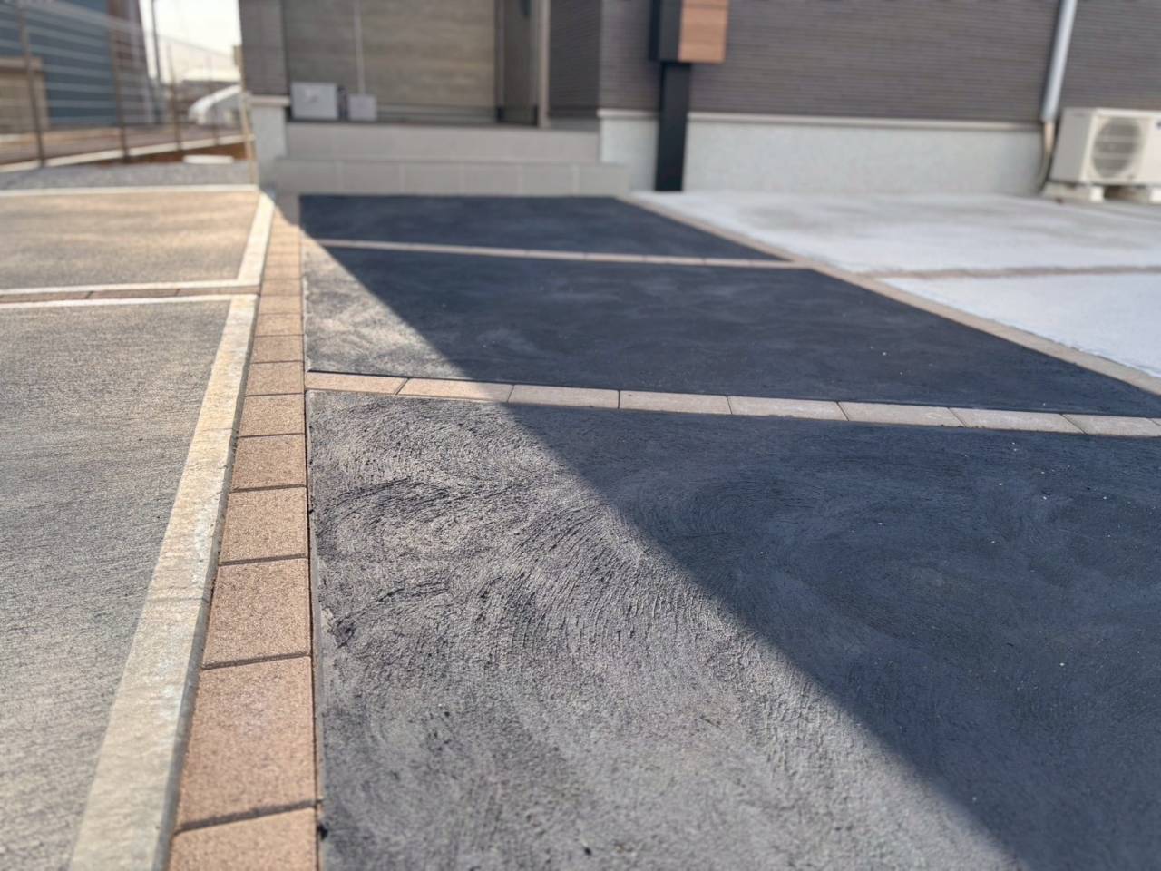 土間コンクリートの一部に炭を混ぜた黒色のコンクリートをアプローチに施工☆