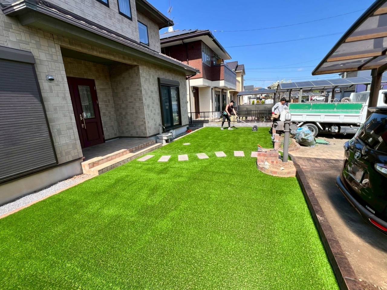 雑草対策にもなる人工芝は景観だけじゃなく泥跳ねや泥汚れ、虫も軽減しておすすめですね☆