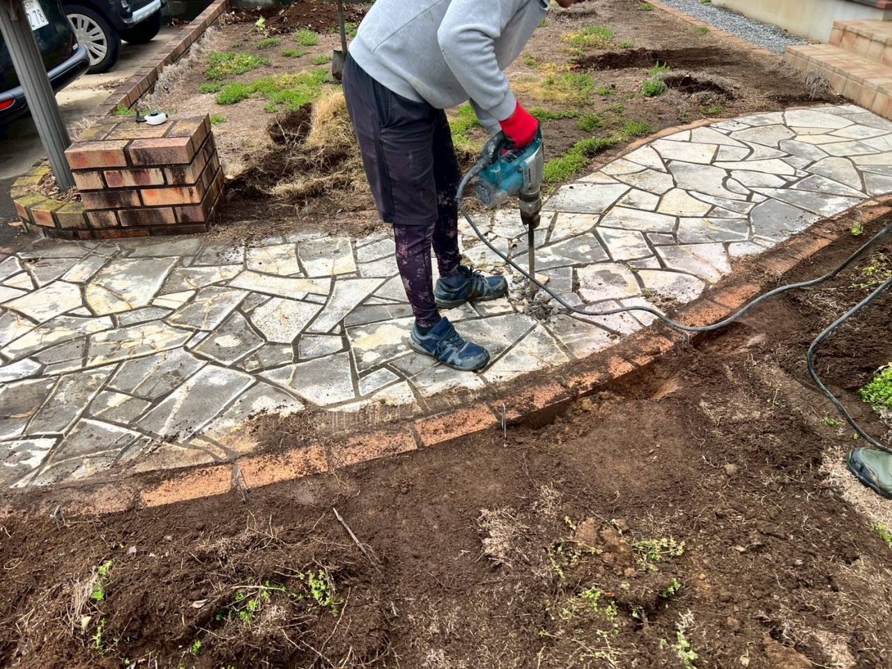 既存の乱張り解体と人工芝とコンクリート平板施工